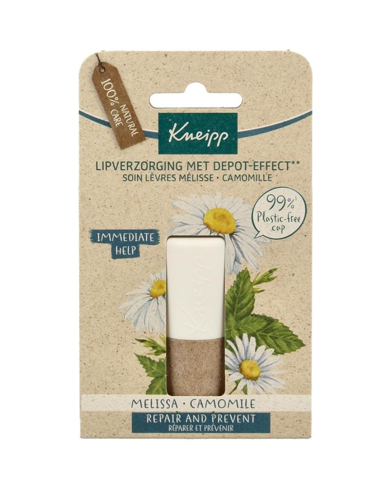 De Kneipp® lippenbalsem Repair & Prevent - Melisse en Kamille is een 100% natuurlijke lippenbalsem met waardevolle extracten van kamille en melisse om gestreste lippen te bestrijden. De formulering met bewezen depot-effect* geeft de lippen intensieve en langdurige verzorging. Hertelt droge en ruwe lippen - meteen effectief. Deze lippenbalsem heeft een duurzame verpakking op basis van graspapier, kurk en paper blend (alternatief voor plastic).