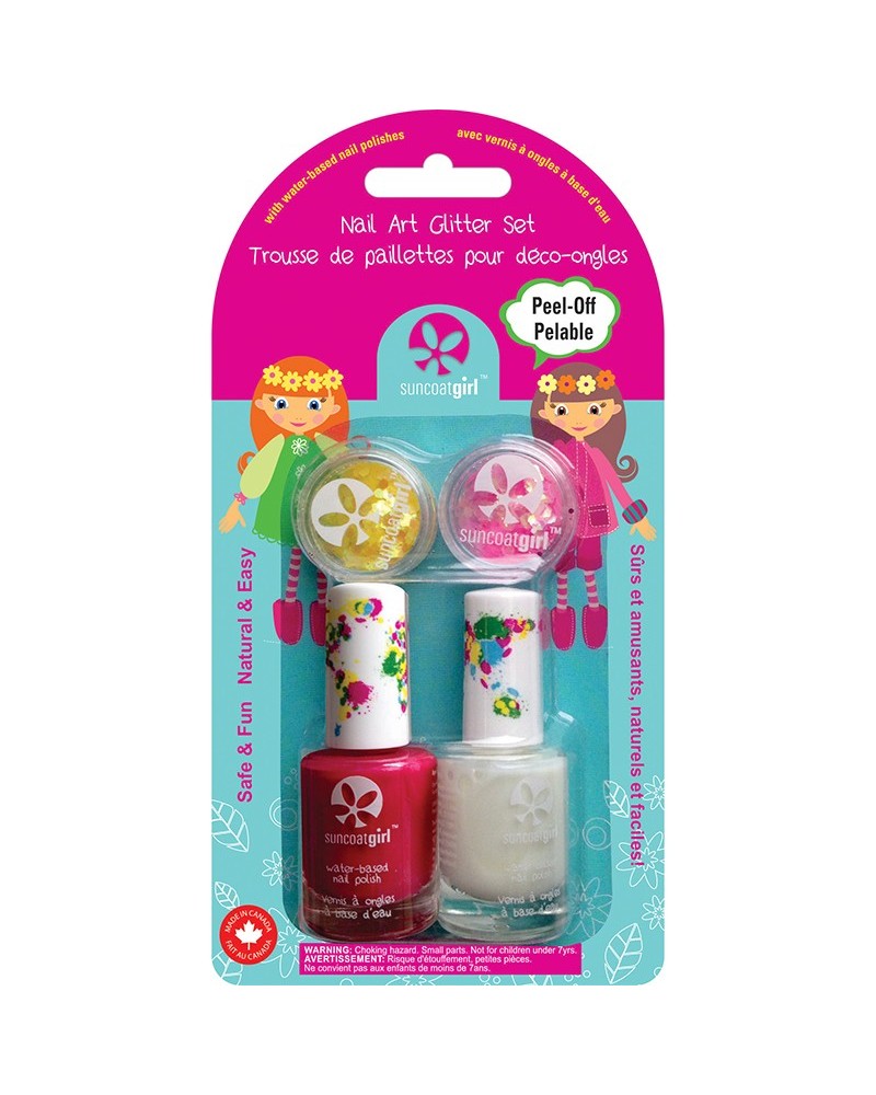 Onze Suncoat Girl eco nagellak is een veilige Peel-off kindernagellak op waterbasis zonder schadelijke stoffen. Deze unieke nagellak voor kinderen is verkrijgbaar in verschillende mooie vrolijke kleuren waarmee je de nagels van je kind eenvoudig, veilig en zonder zorgen in een vrolijk kleurtje lakt. Deze set bevat 2 nagellakjes (roze en clear gloss) en glitters.