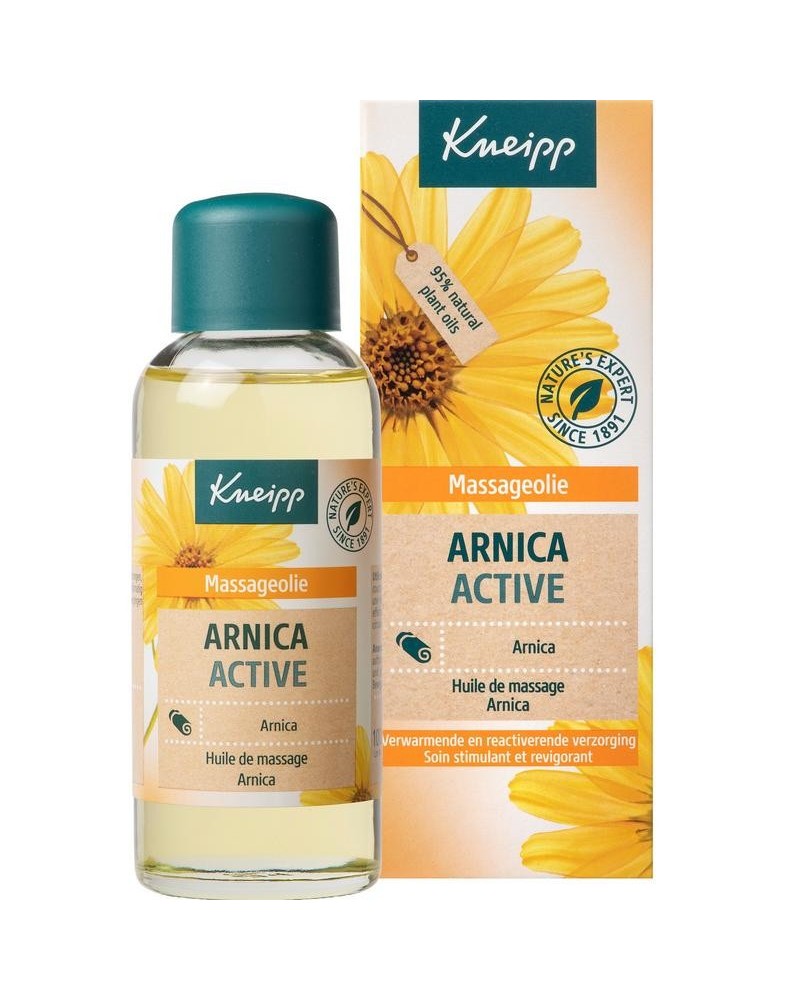 Kneipp Massageolie Arnica Active bevat 95% natuurlijke verzorgende plantaardige oliën zoals arnica- en voedende zonnebloemolie en vochtregulerende amandelolie. Daarnaast ook gemberextracten en sheabutter en celberschermende vitamine E. Deze massageolie ondersteunt de huidverzorging en zorgt ervoor dat de huid ontspannen aanvoelt. Een verwarmende massage met deze olie zorgt voor ontspanning na lichamelijke inspanning en kan zo een gunstig effect hebben op de spieren. De massageolie is gemakkelijk uit te smeren, trekt langzaam in en verspreidt zijn aangename geur door de warmte die vrijkomt tijdens de massage. Ook bijzonder geschikt voor sportmassages.