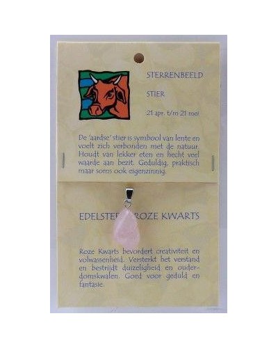 Verwijderen van verlanglijst Toevoegen aan verlanglijst Sterrenbeeldsteen hanger stier Waren Prijs € 9,99 Bestellen Sterrenbeeldsteen Stier - Roze Kwarts