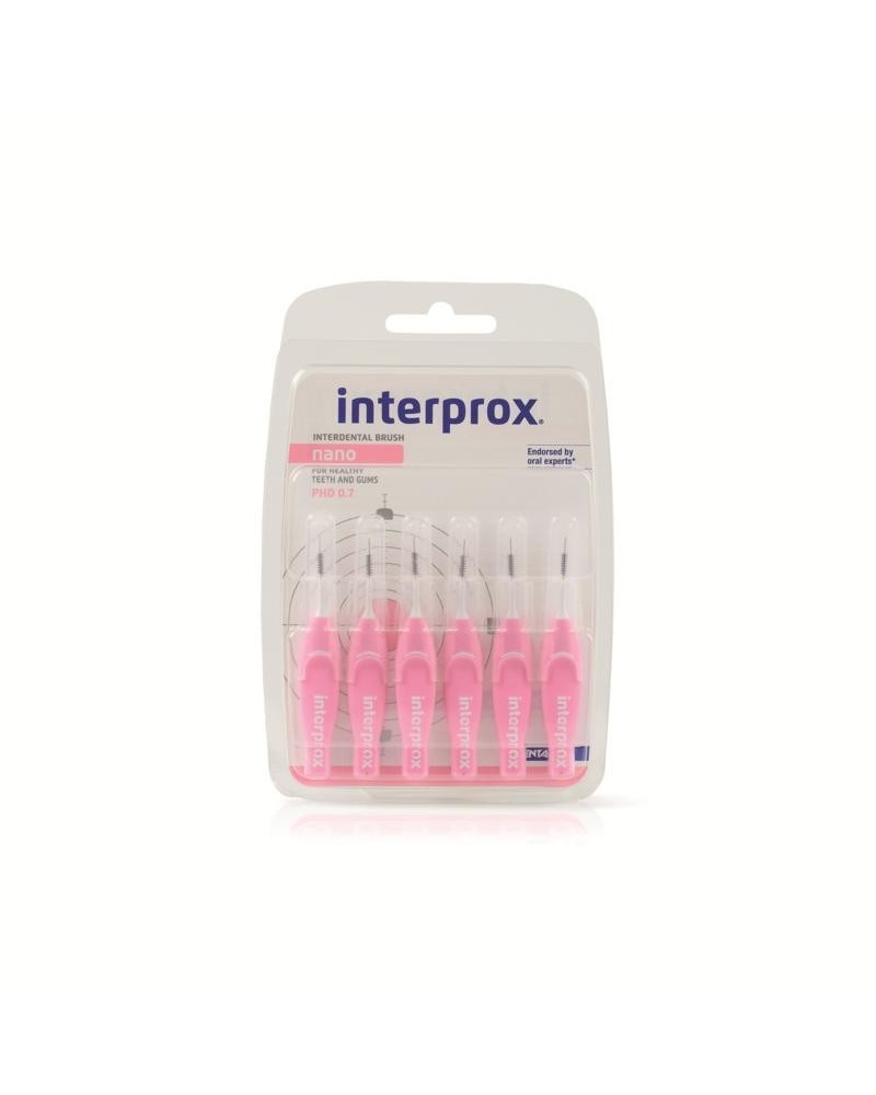 Interprox Nano Roze is speciaal ontwikkeld voor het reinigen van de ruimten tussen tanden vóór in de mond. Cariës (gaatjes) en tandvleesontstekingen beginnen vaak tussen tanden en kiezen. Deze ruimte reinig je het meest effectief met een interdentaal borsteltje. Een borsteltje is effectiever dan tandenstokers of rubbersticks. De ragers van Interprox zijn voor dagelijks gebruik en gaan langer mee. Omdat de interdentale ruimten tussen tanden en kiezen varieert, is het belangrijk om voor iedere specifieke situatie het meest geschikte borsteltje te kiezen. Vraag je mondzorgprofessional welke maat het meest geschikt is. Interprox Nano Roze heeft een praktisch, flexibel handvat en beschikt over een cylindrisch gevormde borstelkop met PHD maat 0.7