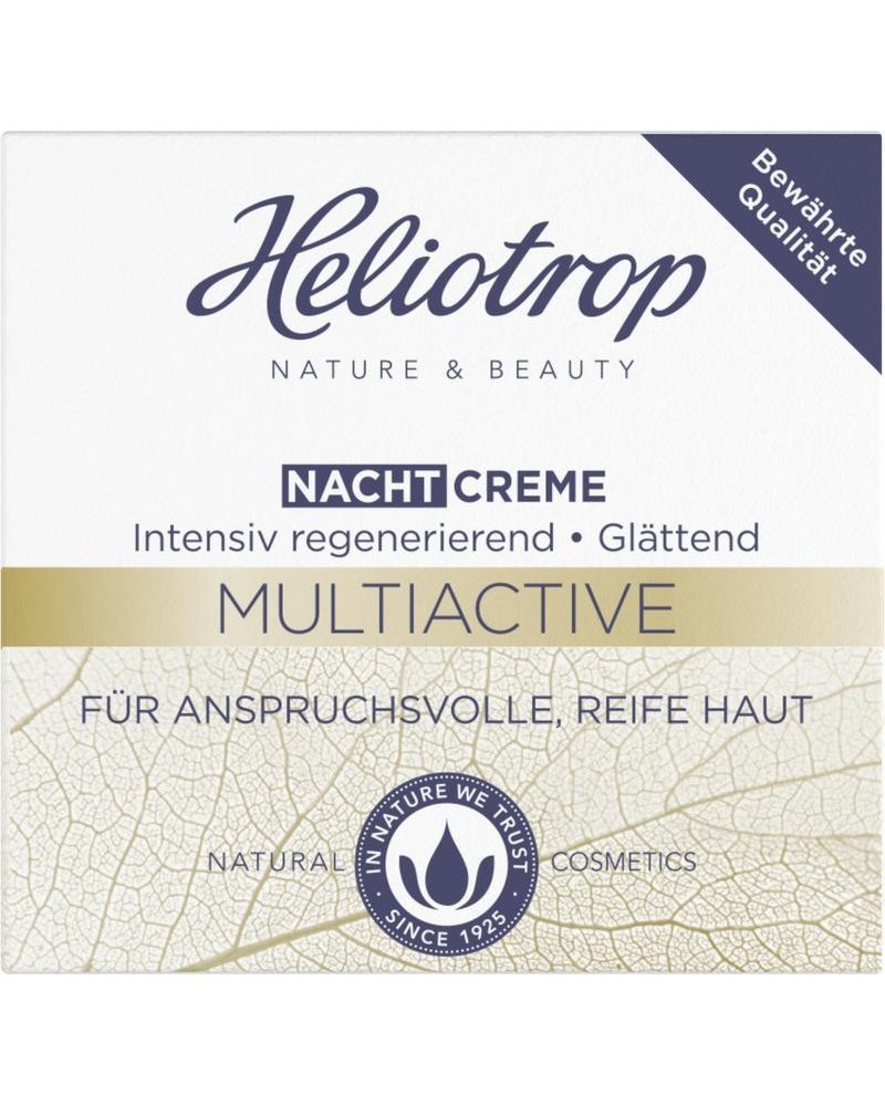 Tijdens de nachtelijke rustfase gaat gerichte ondersteuning van de huideigen regeneratie bijzonder goed de typische verouderingsprocessen tegen. Het intensieve werkstofcomplex van de MULTIACTIVE nachtcrème met macadamianotenolie, effectieve vochtinbrengende crèmes, sheaboter* en ginkgo-extract* verbetert de vochtstatus van de huid, stimuleert de collageensynthese en geeft de huid een merkbaar geregenereerd uiterlijk.