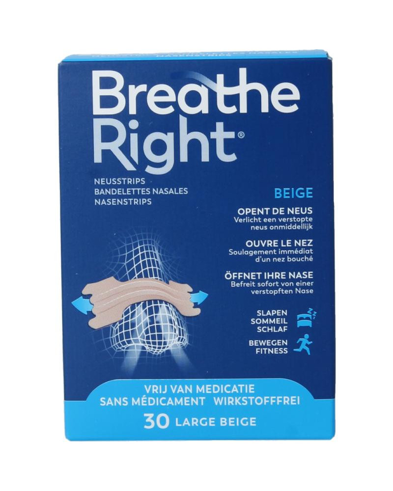 Breathe Right neusstrips openen de neus tot wel 38% beter dan neussprays. Uit onderzoek is gebleken dat 90% van de gebruikers profiteert van een betere slaapkwaliteit met als positief gevolg dat er overdag beter gepresteerd wordt. De neusstrips zijn ook ideaal als prestatieverhogend middel voor sporters. De strips zijn verkrijgbaar in verschillende maten en zijn er voor de normale of gevoelige huid. Deze strips zijn voor de normale huid en hebben de maat Large.