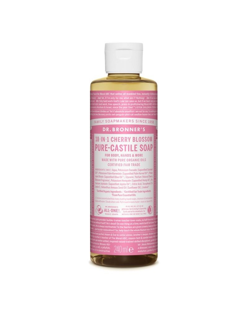 Pure, natuurlijke zeep met de warme geur van biologisch geteelde essentiële oliën. Niets brengt een gevoel van warmte en gezelligheid in de douche als de hemelse amandel zeep Dr. Bronner's. Een geur als vloeibaar marsepein. De zepen bevatten geen synthetische schuimmiddelen, verdikkingsmiddelen of conserveermiddelen en schuimen alleen door de speciale mix van natuurlijke ingrediënten, op basis van 150 jaar ervaring.