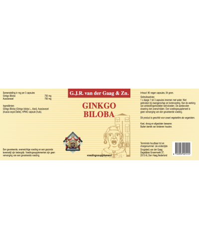 | ingrediënten | Ginkgo Biloba (Ginkgo biloba L., blad)*, Acaciavezel (Acacia seyal Delile)*, HPMC vegetarische capsule (huls). *Biologisch |