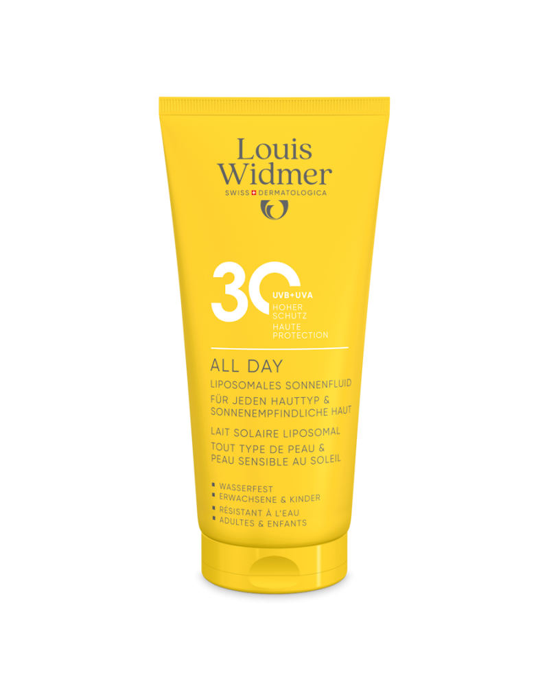 De Louis Widmer All Day 30 maakt het mogelijk om UVA- en UVB-filters in liposomen in te kapselen. De liposomen dringen door tot diep in de hoornlaag waar ze bescherming tegen UV-stralen bieden. Door de liposomen ontstaat een gelijkmatige verdeling van de UV-filters . Ook geschikt voor de gevoelige huid van volwassenen en kinderen.