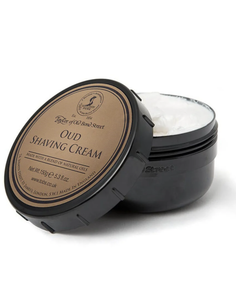 Scheercrème 150g 'Oud' in een pot van 150g. De scheercrème is eenvoudig op te schuimen tot een glad en romig schuim, Het verzacht de baardharen, beschermt de huid en is vochtinbrengend voor een glad scheerresultaat. Oud heeft een heldere perzikgeur met een kruidig hart van roos en saffraan. Verassend zijn de basistonen van warm-lichtkruidige oud en amber.