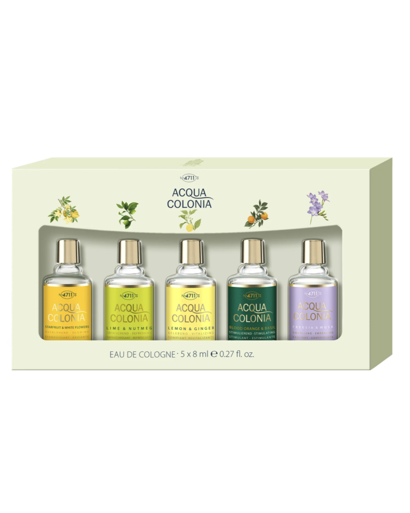 Acqua Colonia 4711De miniatuurset bevat vijf iconische eau de colognes uit de lijn waar het huis bekend om staat, die het lichaam en de zintuigen inspireren met geselecteerde contrasterende ingrediënten uit de natuur.