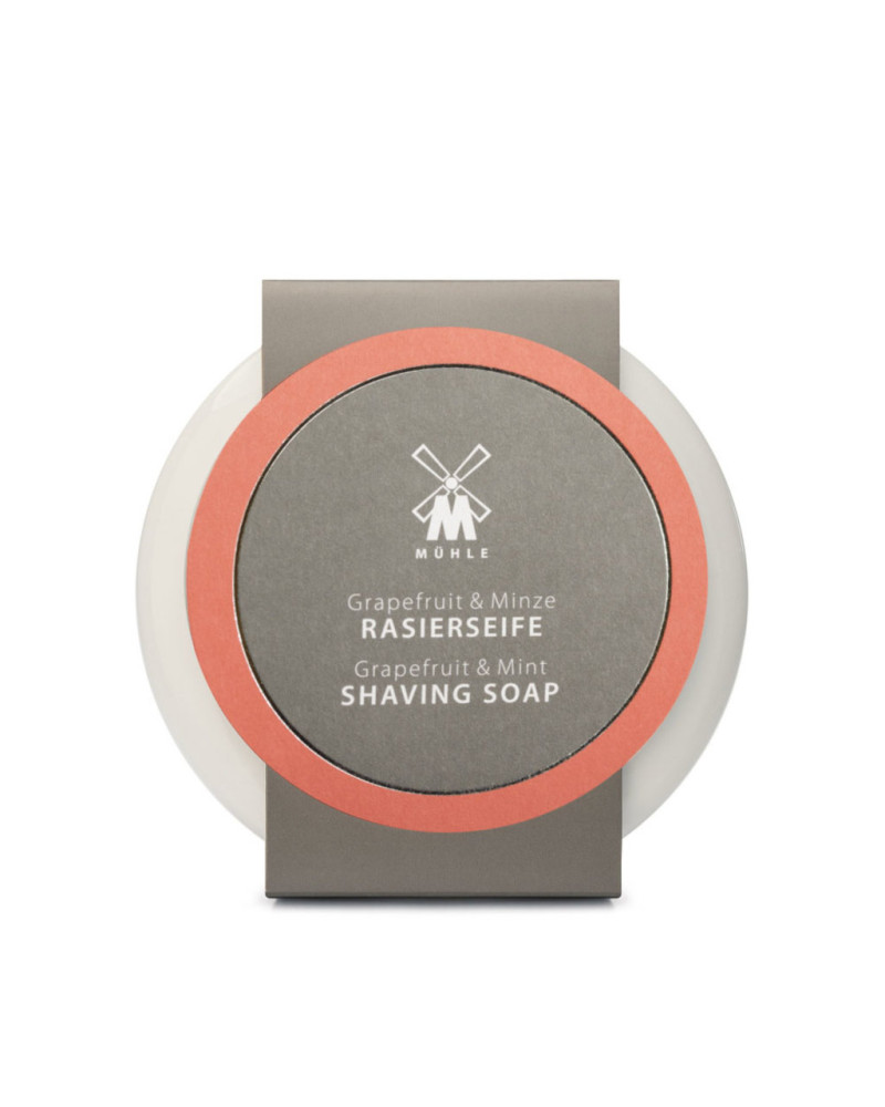 Grapefruit & Mint scheerzeep in duurzame porseleinen kom met deksel. Inhoud: 65g. Kalmerende en hydraterende scheerzeep verrijkt met Grapefruit & Mint. Ø 60mm. De scheerzeep wordt gebruikt met een scheerkwast en geeft een mooi romig schuim. MÜHLE Grapefruit & Mint. De combinatie van fruitige pompelmoes, verfrissende munt en fijn uitgebalanceerde bittere tonen van zwarte peper, cederhout, amber en vetiver maken van scheren een verfrissende ervaring. Vitaliserende muntolie heeft een aangenaam, licht verkoelend effect op de huid.