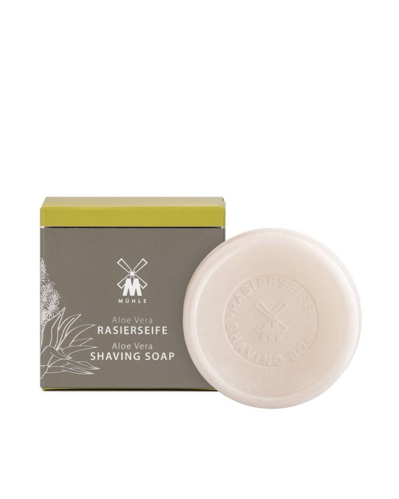 Aloë Vera scheerzeep 65g. Navulverpakking voor de porseleinen kom of MÜHLE zeepbakje. Kalmerende en hydraterende scheerzeep verrijkt met Aloë Vera. Doorsnede zeep 60 mm. De scheerzeep wordt gebruikt met een scheerkwast en geeft een mooi romig schuim. MÜHLE Aloë Vera is speciaal ontwikkeld voor gevoelige huid, maar natuurlijk ook geschikt voor alle andere huidtypen. De werkelijke stof wordt geëxtraheerd vanuit de binnenkant van gekweekte aloëplanten van het Middellandse Zeegebied. De natuurlijke ingrediënten kalmeren en verfrissen de huid en de zintuigen tijdens het scheren. Aloë Vera is zacht en verzorgend met fijne noten van eikmos en munt.