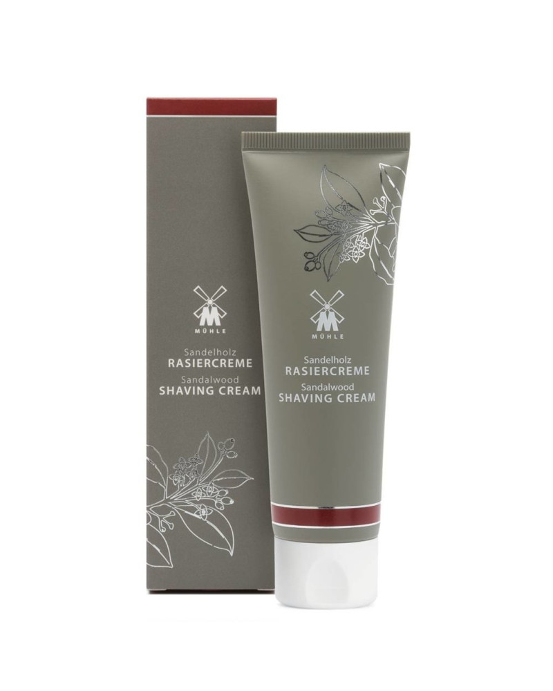 Sandalwood scheercrème in tube van 75ml. De scheercrème is eenvoudig op te schuimen tot een glad en romig schuim. Het verzacht de baardharen, beschermt de huid en is vochtinbrengend voor een glad scheerresultaat. MÜHLE Sandalwood is ontwikkeld voor de normale en droge huid. De ingrediënten komen uit concentraat van oosters sandelhout. De natuurlijke essentiële olie wordt gewonnen middels een meervoudig destillatieproces. Sandalwood voedt en verzacht de huid en de zintuigen. De geur is warm en sensueel. Met fijne geurnotities van koriander en steranijs.