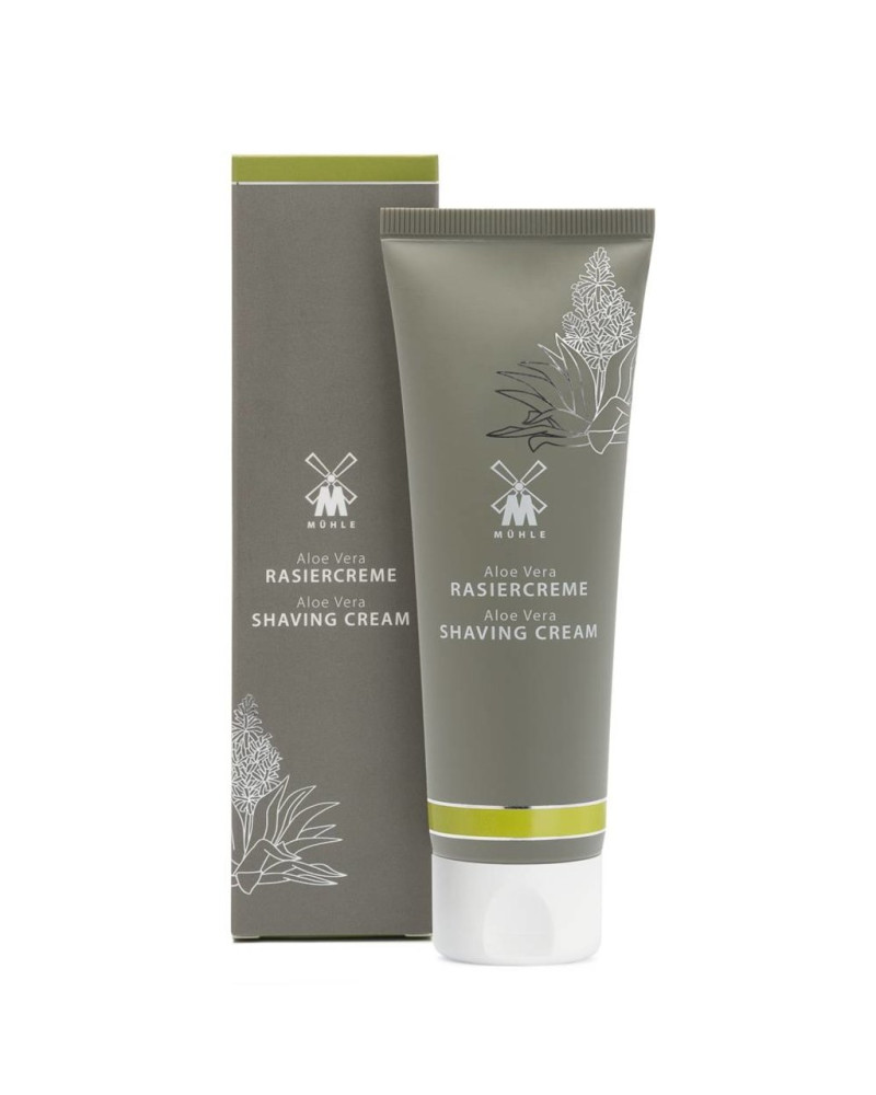 Aloë Vera Scheercrème in tube 75ml. De scheercrème is eenvoudig op te schuimen tot een glad en romig schuim. Het verzacht de baardharen, beschermt de huid en is vochtinbrengend voor een glad scheerresultaat. MÜHLE Aloë Vera is speciaal ontwikkeld voor gevoelige huid, maar natuurlijk ook geschikt voor alle andere huidtypen. De werkelijke stof wordt geëxtraheerd vanuit de binnenkant van gekweekte aloëplanten van het Middellandse Zeegebied. De natuurlijke ingrediënten kalmeren en verfrissen de huid en de zintuigen tijdens het scheren. Aloë Vera is zacht en verzorgend met fijne noten van eikmos en munt.
