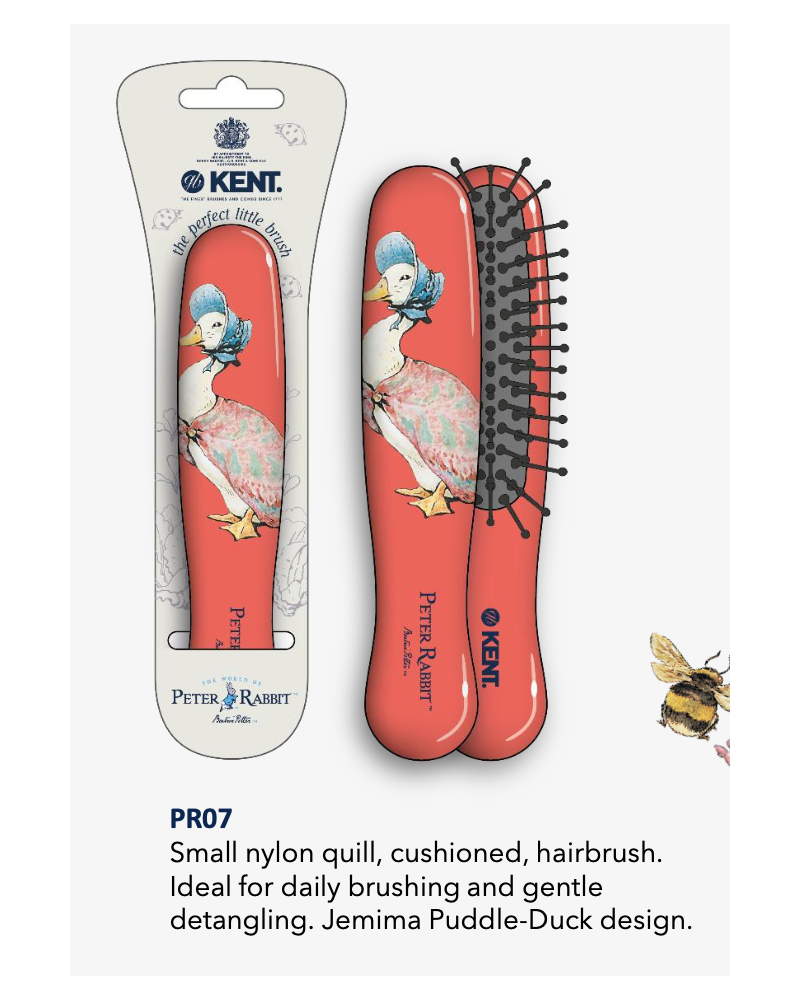 Small nylon quill, cushioned, hairbrush. Ideal for daily brushing and gentle detangling. Jemima Puddle-Duck design.