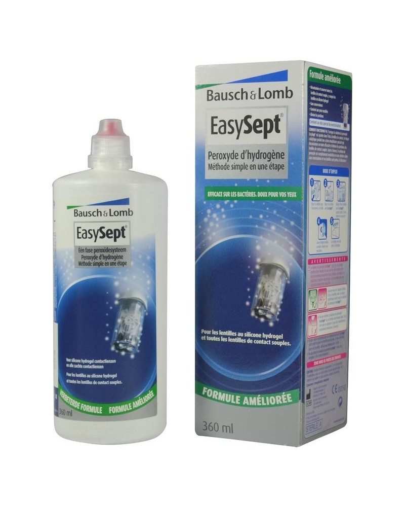 Bausch & Lomb EasySept Lenzenvloeistof is een eenvoudige één-fase peroxidesysteem om contactlenzen mee te desinfecteren en te bewaren. Deze 3% waterstofperoxide vloeistof biedt een doeltreffende desinfectie tegen micro-organismen. De vloeistof is hard tegen bacteriën, maar zacht voor uw ogen. De vloeistof kan veilig gebruikt worden met alle zachte week, twee-week- en maandlenzen.