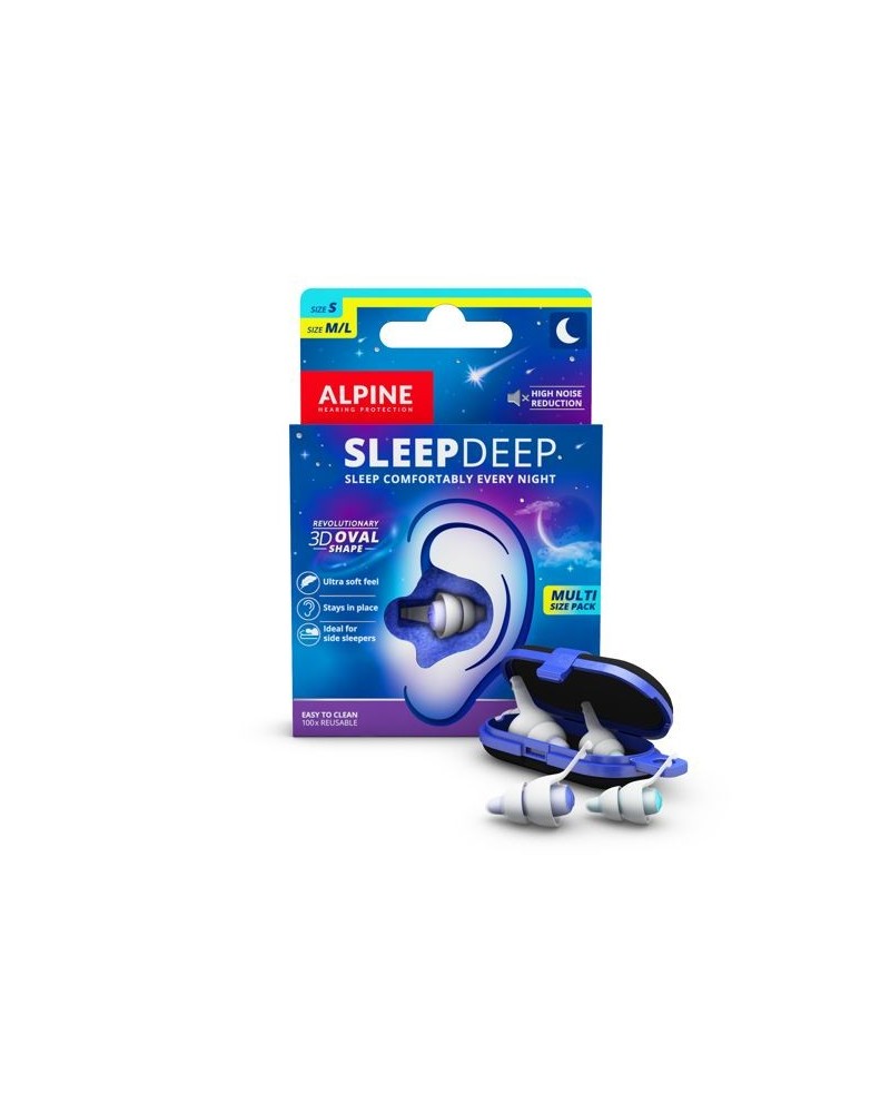 SleepDeep is de meest comfortabele slaapoordop ooit gemaakt, speciaal ontwikkeld voor een goede nachtrust. SleepDeep Multi-size is een combipack van SleepDeep Original en SleepDeep Mini en bevat twee maten zodat je kunt testen welke maat bij jouw gehoorgang past. De oordoppen combineren ultiem comfort met maximale demping. De unieke 3-D ovale vorm van de oordop volgt de natuurlijke vorm van je gehoorgang waardoor de oordoppen niet uitvallen of pijn doen wanneer je op je zij slaapt. Daarnaast bevat SleepDeep revolutionaire geluidsabsorberende gel die maximale demping op omgevingslawaai en gesnurk geeft. SleepDeep oordoppen hebben een gemiddelde demping (SNR) van 27 dB. Dat houdt in dat de meeste omgevingsgeluiden worden gedempt. Zo slaap je lekker gedurende de gehele nacht! Deze innovatieve oordoppen zijn gemaakt van speciaal door Alpine ontwikkeld thermoplastisch materiaal: AlpineThermoShape. Dit materiaal is ultra zacht en huidvriendelijk, vormt zich naar het oor waardoor de oordoppen perfect passen en op hun plek blijven zitten. Dit materiaal bevat geen siliconen en veroorzaakt daardoor geen allergische reacties of jeuk. Gebruik de oordoppen in elke situatie; thuis in de slaapkamer, tijdens het studeren, concentreren, ontspannen of reizen. De verpakking is volledig recyclebaar. Deze oordop is het antwoord op ongemakkelijke oplossingen zoals schuim en wax. Het kan worden gebruikt voor slapen, studeren, concentreren, ontspannen, reizen vanwege de hoge ruisonderdrukking bij storende geluiden. Probeer de meest innovatieve slaapoordop die is ontworpen voor een diepe nachtrust.