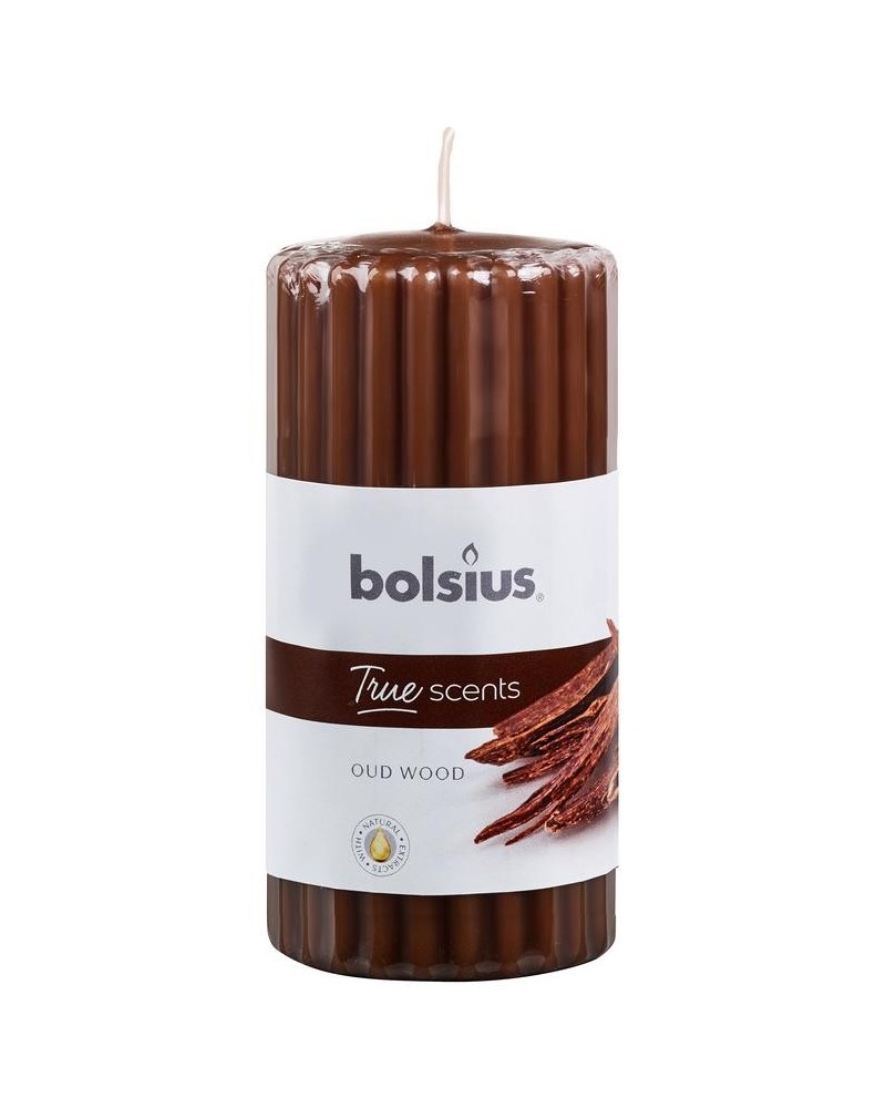 De warmbruine Bolsius Oud Wood geribbelde geurkaars is 12cm hoog en brandt tot wel 33 uur lang.