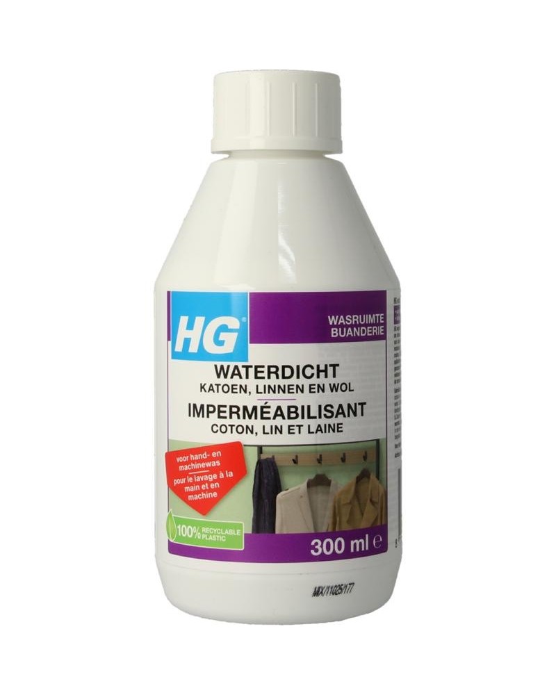 Katoen waterdicht maken? HG waterdicht voor textiel maakt wol, katoen, linnen en alle hiermee gemengde weefsels waterdicht. Daarnaast zorgt het er ook voor dat deze materialen vuilafstotend worden. Dit hoog geconcentreerde product is zeer makkelijk in gebruik.