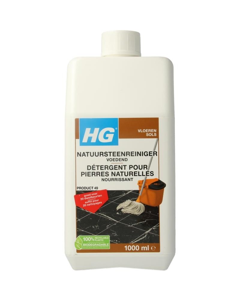 Marmeren vloer reinigen? HG natuursteenreiniger voedend is een fris ruikende, geconcentreerde en voedende dweilreiniger voor vloeren van marmer en andere natuursteensoorten. Speciaal ontwikkeld om bij iedere dweilbeurt het natuursteen niet alleen te reinigen, maar ook weer te voeden (te hydrateren), waardoor het natuursteen niet schraal wordt en zijn oorspronkelijke uitstraling behoudt. De marmeren vloer schoonmaken en voeden in één behandeling.