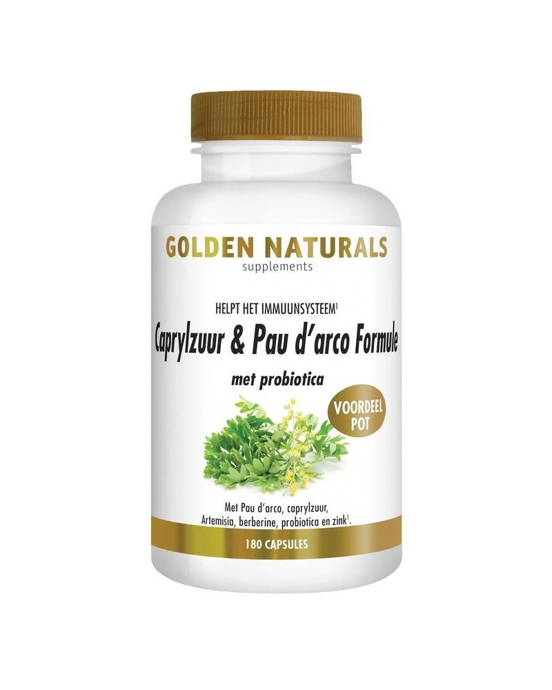 Golden Naturals Caprylzuur & Pau d'arco met probiotica. Met Pau d'arco, caprylzuur, Artemisia, berberine, probiotica en zink.