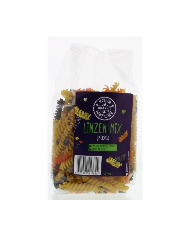 Gele linzenmeel* 50%, rode linzenmeel* 25%, zwarte linzenmeel* 25%.