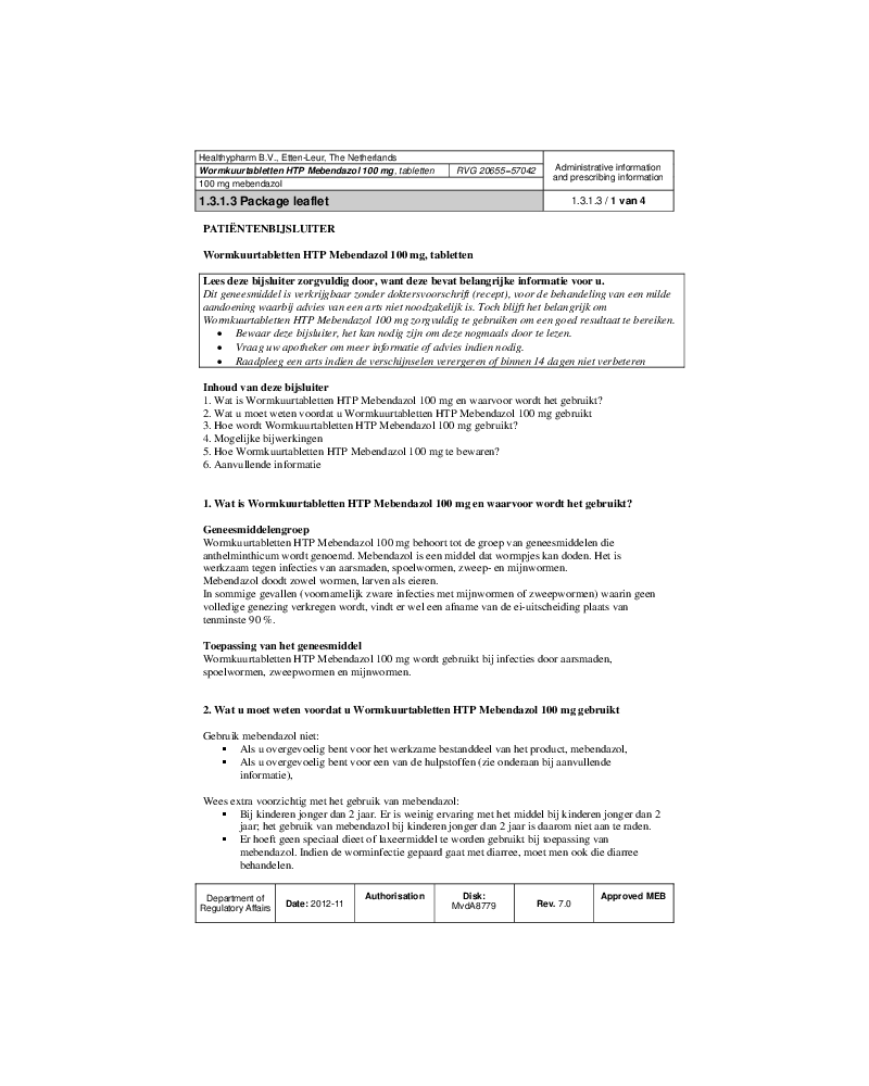 Wormkuurtabletten HTP Mebendazol 100 mg behoort tot de groep van geneesmiddelen die anthelmintica wordt genoemd. Mebendazol is een middel dat wormpjes kan doden. Het is werkzaam tegen infecties van aarsmaden, spoelwormen, zweep- en mijnwormen.