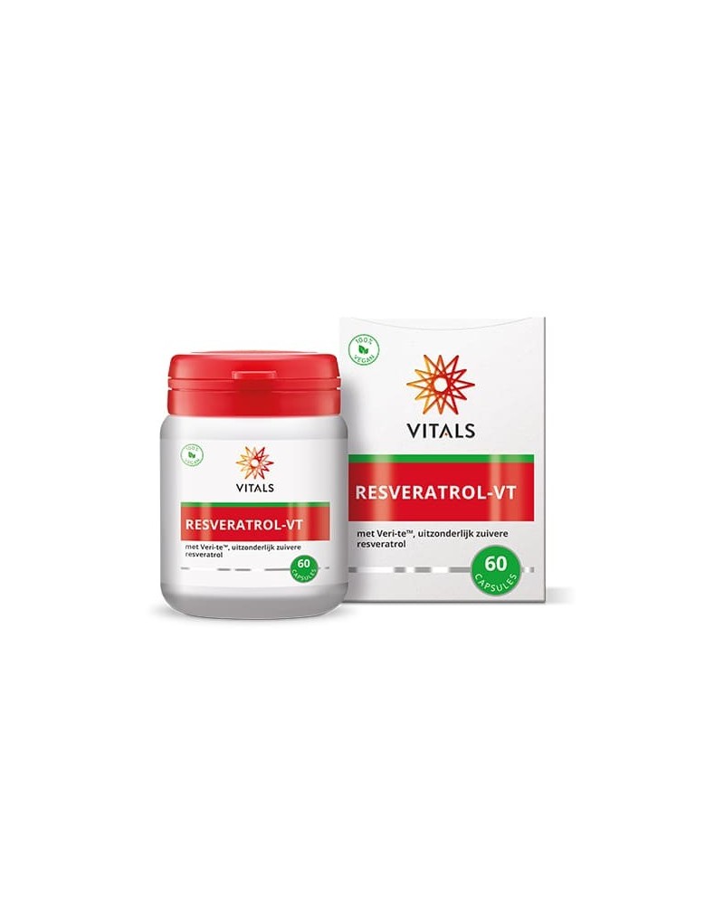 Resveratrol-VT van Vitals bevat zeer zuivere resveratrol in de trans-vorm (de biologisch actieve vorm in tegenstelling tot de cis-vorm die vrijwel geen werking heeft). Het wordt geproduceerd door middel van een modern fermentatieproces dat gebruikmaakt van bakkersgist (Saccharomyces cerevisiae).