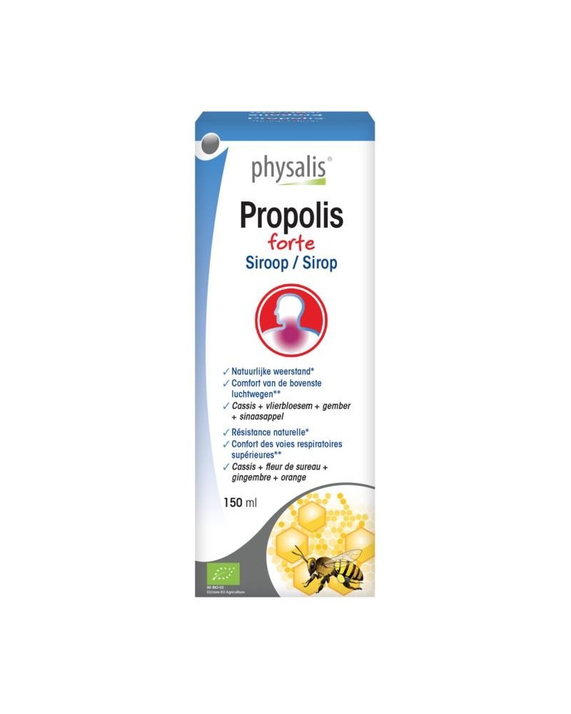 Physalis Propolis forte bio siroop bevat extracten van propolis, zwarte bes en vlier, alsook essentiële oliën van gember en sinaasappel.