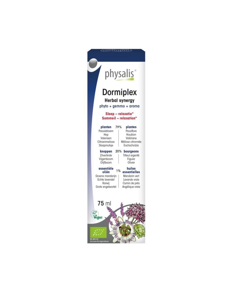 Hydroalcoholische extracten van passiebloem* (20%), hop* (20%), valeriaan* (20%), citroenmelisse* (10%) en slaapmutsje* (9%), hydroalcoholische glycerol knopextracten van zilverlinde* (6,7%), vijgenboom* (6,7%) en olijfboom* (6,6%), essentiële oliën van groene mandarijn* (0,25%), echte lavendel* (0,25%), karwij* (0,25%) en grote engelwortel* (0,25%).