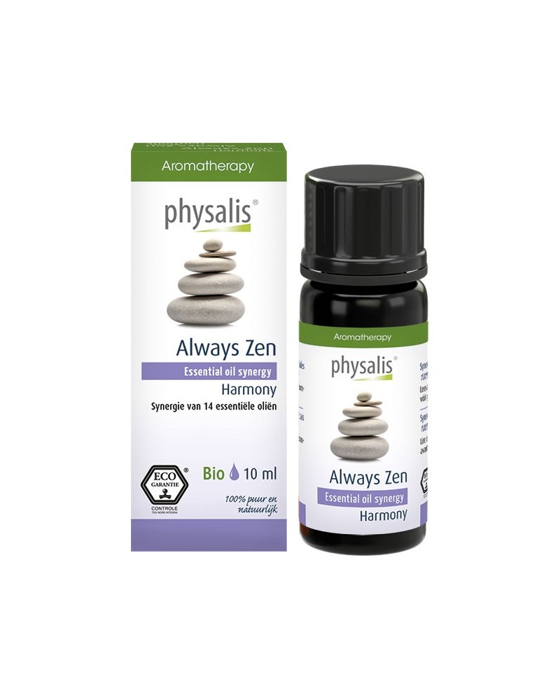 Vind je innerlijke rust terug met Physalis Always Zen dankzij de synergie van 14 essentiële oliën. Bevat o.a. lavendel, lavandin, groene mandarijn, bergamot, ravintsara en marjolein. Physalis Always Zen is bij uitstek geschikt om kalmte en gemoedsrust te vinden en uw hoofd leeg te maken.