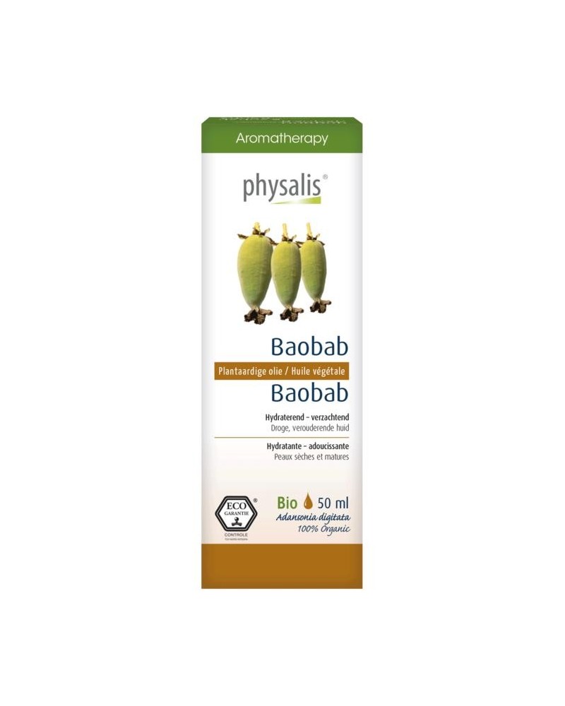 Physalis bio baobabolie is een goudgele, erg stabiele olie die rijk is aan verzadigde vetzuren. De olie wordt geperst uit de zaden van de baobabvrucht van de apenbroodboom die voorkomt in de Afrikaanse savannes en Madagascar.