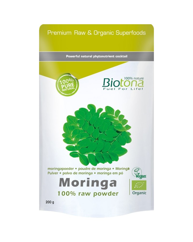 Biotona Bio Moringa Raw bestaat uit de bladeren van de Moringa oleifera, een snelgroeiende boom die goed gedijt in (sub) tropische gebieden in India en Afrika, op droge zanderige gronden. Bijna elk deel van de boom kan gebruikt worden als voedsel (ingrediënt) en hij wordt dan ook terecht een “wonderboom” genoemd. Zelfs in de Ayurveda, de traditionele Indiase geneeskunde, wordt moringa beschreven als een natuurlijk middel bij talrijke aandoeningen. Recentelijk werd moringa herontdekt door de wetenschap en de Westerse wereld en door velen gedoopt tot de meest ideale en complete voedselbron op aarde. De moringabladeren hebben een breed nutritioneel profiel, zijn rijk aan proteïnen en bevatten een schat aan fytonutriënten. Biotona Moringa is gemaakt van 100% biologische moringabladeren, die na het oogsten en een zorgvuldige reiniging worden gedehydrateerd, zodat hun nutritionele waarde gegarandeerd bewaard blijft.