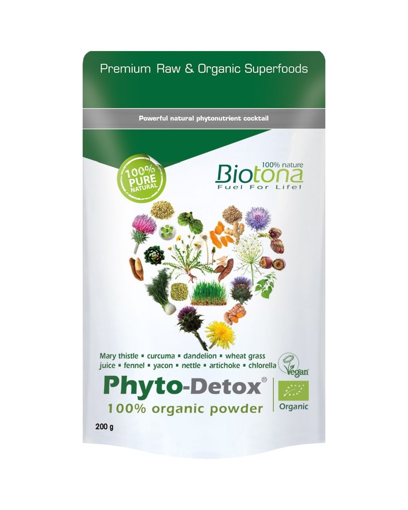 Poeder (100%) van mariadistel*, geelwortel*, paardenbloem*, tarwegrassap*, venkel*, yacon*, brandnetel*, artisjok*, chlorella*. *biologische teelt (Silybum marianum, Curcuma longa, Taraxacum officinale, Triticum aestivum, Foeniculum vulgare, Smallanthus sonchifolius, Urtica dioica, Cynara scolymus, Chlorella pyrenoidosa)