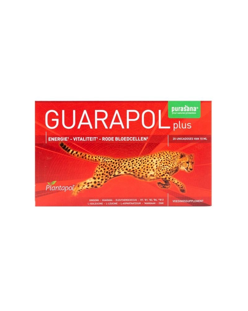 Guarapol Plus bevat vitamine B1, B2, B12 en mangaan die het energieleverend metabolisme ondersteunen. Guarapol Plus is een hulp bij zwakte, tijdelijke vermoeidheid en tijdelijke stress, dankzij ingrediënten als vitamine B2, B6 en B12 die bijdragen aan het verminderen van vermoeidheid en moeheid, mangaan draagt bij aan het normale functioneren van het zenuwstelsel. Vit B6 en B12 dragen bij tot de formatie van rode bloedcellen, onder andere betrokken bij het zuurstoftransport in het lichaam.