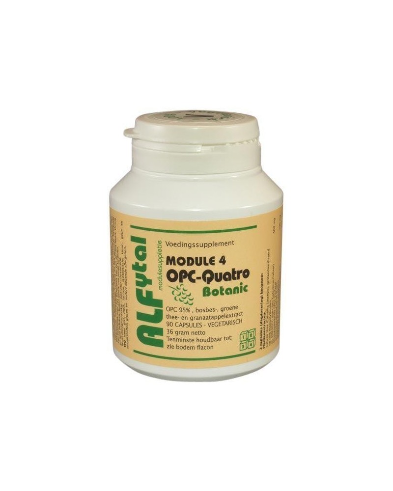 OPC-Quatro bevat vier natuurlijkje gestgandaardiseerde plantenextracten die samen een rijke bron vormen van polyfenolen. OPC-Quatro kan worden gebruikt naast de Alfytal Oxi-Protector (er zijn geen overlappingen), maar kan ook los daarvan worden toegepast. OPC-Quatro is door toevoeging van groene thee-, blauwe bosbessen- en granaatappelextract meer dan OPC alleen.