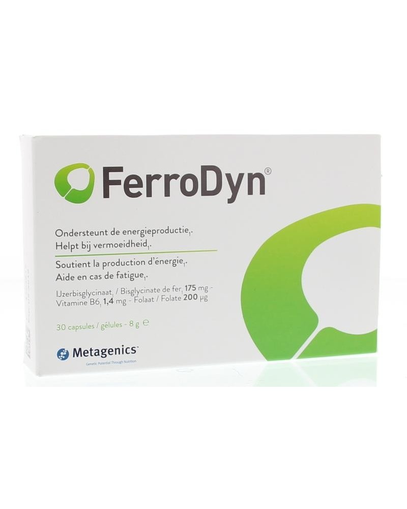 FerroDyn is een compleet ijzercomplex dat de rode bloedcelvorming en energieproductie ondersteunt en helpt tegen vermoeidheid. De gebruikte ijzervorm is ijzerbisglycinaat.