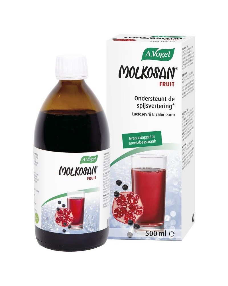 Molkosan Fruit bevat 100% natuurlijke melkwei met granaatappel, aroniabes en stevia.