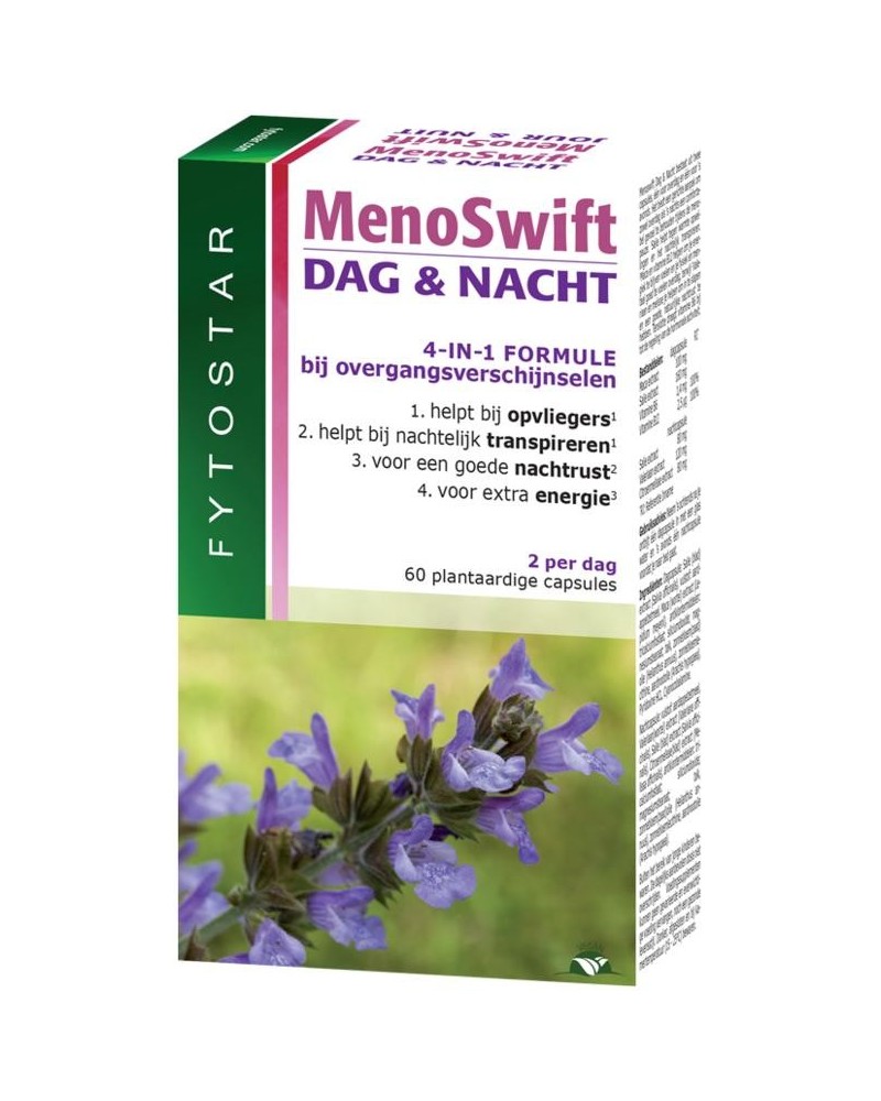 Menoswift Dag & Nacht bestaat uit twee capsules, één voor overdag en één voor 's avonds. Het biedt een gerichte aanpak om zowel overdag als 's nachts een comfortabel gevoel te behouden tijdens de menopauze.