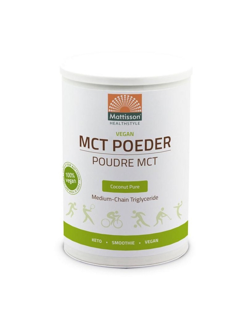 MCT staat voor Medium-Chain Triglyceride en is een type vetzuur. Medium-Chain betekent dat de vetzuren een middellange keten hebben. MCT poeder geeft snel energie en wordt niet opgeslagen als vet. Daarom wordt het ook door sporters gebruikt als supplement.