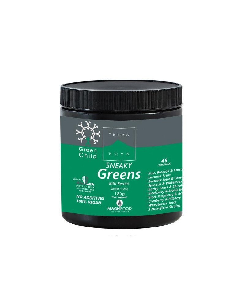 Terranova Green Child Sneaky Greens Super-Shake is een aangenaam smakend, voedzaam poeder dat bijvoorbeeld in sap, water of een smoothie kan worden gemengd. Deze mix van voornamelijk biologische groenten en fruit (met