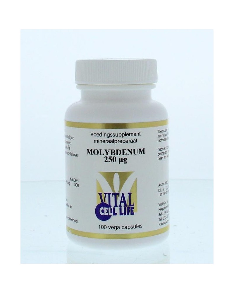 | Molybdenum (di-natriummolybdaat) | 250 mcg | 500 |