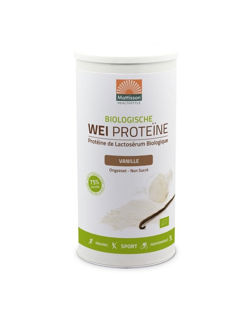 Biologische wei proteïne poeder vanille is een wei concentraat met als enige toevoeging Bourbon vanille. Wei concentraat bevat een eiwit gehalte van 75%. Van de verschillende proteïnebronnen heeft wei eiwit de hoogste biologische beschikbaarheid, waardoor het makkelijk door het lichaam kan worden opgenomen. Naast eiwit bevat wei concentraat ook koolhydraten, lactose en vet. Dit geeft wei concentraat een rijkere smaak dan wei-isolaat en zorgt ervoor dat het goed mengt.