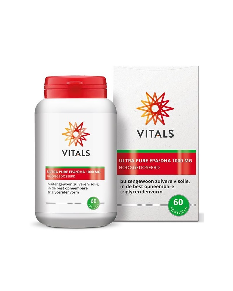 Ultra Pure EPA/DHA 1000 mg van Vitals is een visoliepreparaat dat de belangrijke omega 3-vetzuren eicosapentaeenzuur (EPA) en docosahexaeenzuur (DHA) bevat in een bijzonder hoge dosering, met een mooie balans tussen EPA en DHA. Het is uitermate geschikt voor mensen die hun omega 3-vetzuurstatus optimaal willen ondersteunen of specifieke gezondheidseffecten willen bewerkstelligen. De opneembaarheid van de vetzuren in Ultra Pure EPA/DHA 1000 mg is uitstekend omdat deze in de hoogwaardige triglyceridenvorm zijn. Producent Golden Omega staat erom bekend dat ze visolie maken die uiterst zuiver is. Bovendien zijn de totale oxidatie-waarden (TOTOX) bij elke batch olie zeer laag. De olie zelf is zeer helder van kleur, wat een afspiegeling is van de uitzonderlijk hoge kwaliteit. Alles bij elkaar genomen is Ultra Pure EPA/DHA 1000 mg hooggedoseerd, zuiver, buitengewoon vers en goed opneembaar. Kortom, u kunt met een gerust hart kiezen voor Ultra Pure EPA/DHA 1000 mg van Vitals!