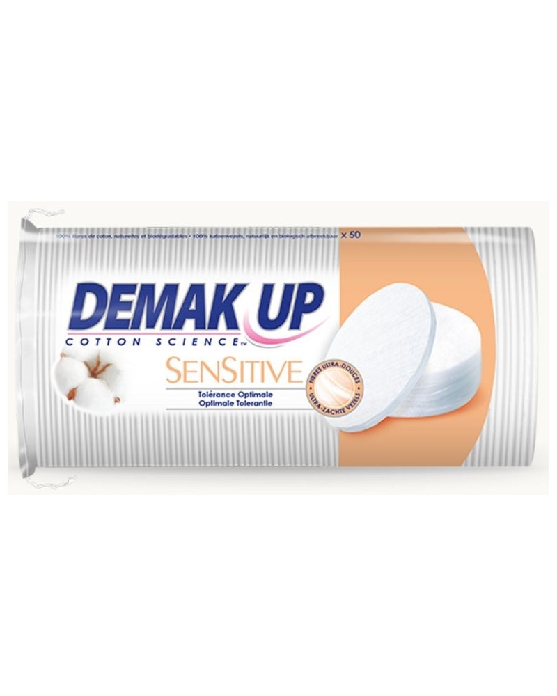 Demak'Up Sensitive wattenschijfjes zijn speciaal voor de gevoelige huid. Ze bevatten uiterst zachte vezels en extracten van katoenolie, die bekend staat vanwege zijn verzachtende en kalmerende eigenschappen. De wattenschijfjes reinigen de meest gevoelige zones op een delicate manier, zoals bijvoorbeeld de fijne huid rond de ogen.