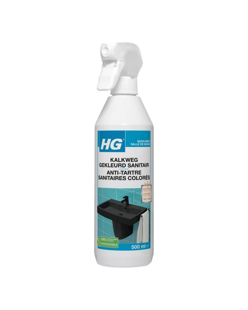HG kalkweg gekleurd sanitair verwijdert veilig, snel en grondig kalk van gekleurd sanitair, zoals zwarte kranen, douches en wasbakken. Maar natuurlijk ook van koper- goud-, gunmetal- en roségekleurd sanitair. Hiermee is het dé kalkreiniger voor gekleurd sanitair. Deze antikalk voor gekleurd sanitair is uniek en is de enige speciaal ontwikkelde kalkverwijderaar voor gekleurd sanitair waar u veilig uw gekleurde kranen, douches en wasbakken mee kunt ontkalken. Deze kalkverwijderaar voor gekleurd sanitair verwijdert niet alleen kalk, maar ook zeepresten en vuil.