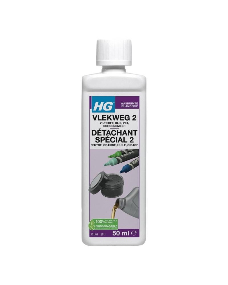 HG vlekweg 2 verwijdert vlekken uit textiel van: schoensmeer, viltstift, olie & vet, maar ook spijsolie, frituurvet, smeer, stickers en tippex. HG vlekweg 2 is één van de 7 speciale HG vlekken verwijderaar producten.