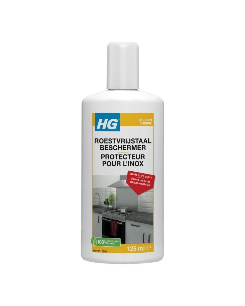 HG roestvrijstaal beschermer laat roestvrijstaal glanzen als nooit tevoren en is onmisbaar in de keuken. Deze RVS glans is een gebruiksklaar onderhouds- en beschermmiddel dat doffe oppervlakken weer laat glanzen.
