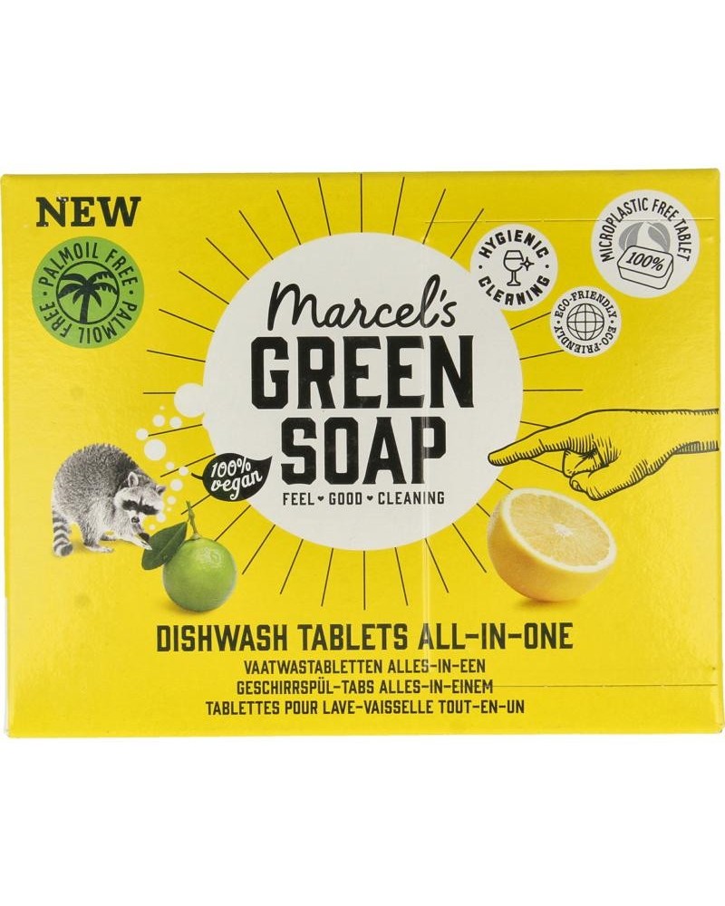 Marcel's Green Soap alles-in-één vaatwastabletten zitten bomvol natuurlijke ingrediënten, zijn 100% plasticvrij, palmolievrij en vegan. Zoals alle producten van Marcel’s Green Soap, bevatten onze vaatwastabletten geen kleurstoffen, parabenen, fosfaten, chloor, ammonia of zuren. Sterker nog, ze zitten bomvol natuurlijke ingrediënten en zijn minstens 97% biologisch afbreekbaar! De vaatwastabletten zijn verpakt in een oplosbare folie. Op deze manier hoef je niet met je natte handen op zoek naar een schaar om het plastic eraf te halen, en besparen we ook weer een hoop plastic. De folie is gemaakt van maïszetmeel en lost op tijdens het wassen. Je hoeft je dus niet druk te maken over plastic dat achterblijft in de machine of het riool.