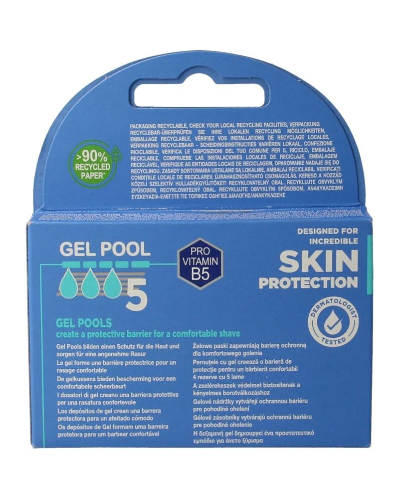 - 7 Hydro Gel depots: de HYDRO 5 Skin Protection scheermesjes hebben geen glijstrip als andere scheersystemen, maar een innovatief gel-reservoir*. Dit wordt door water geactiveerd en zorgt voor 4% minder wrijving**