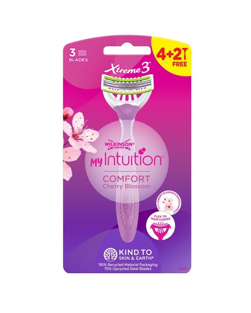 Wilkinson Sword my Intuition Xtreme 3 Comfort is het vrouwen wegwerpscheermesje voor een zacht, comfortabel en aangenaam scheerresultaat. De 3 flexibele mesjes passen zich aan de contouren van je lichaam aan. Verrijkt met Jojoba-lie, Vitamine E, Aloë Vera en Shea boter waardoor je huid zacht aanvoelt. Het handvat is gemaakt van 30% gerecycled plastic. Deze verpakking bevat 6 (4+2 gratis) wegwerpmesjes.