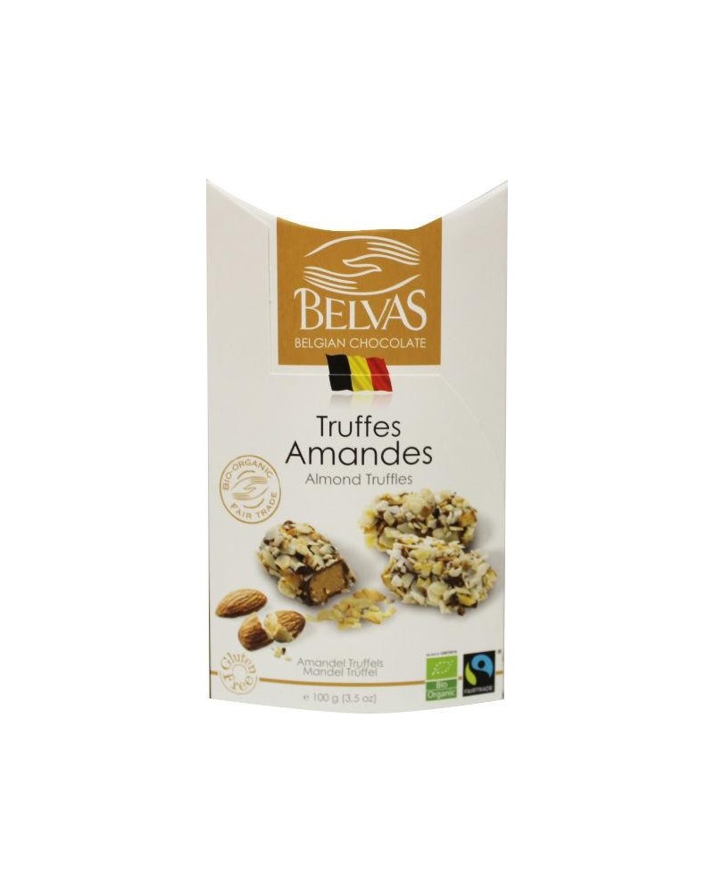 Heerlijk smeuïge truffels met bio- en Fairtrade melkchocolade van cacaobonen vanop de Peruaanse hoogvlakten. Om het helemaal af te maken, zijn deze truffels royaal bestrooid met geschaafde amandelen uit Murcia, geroosterd in de “thuisoven” van de Belvas-werkplaats.